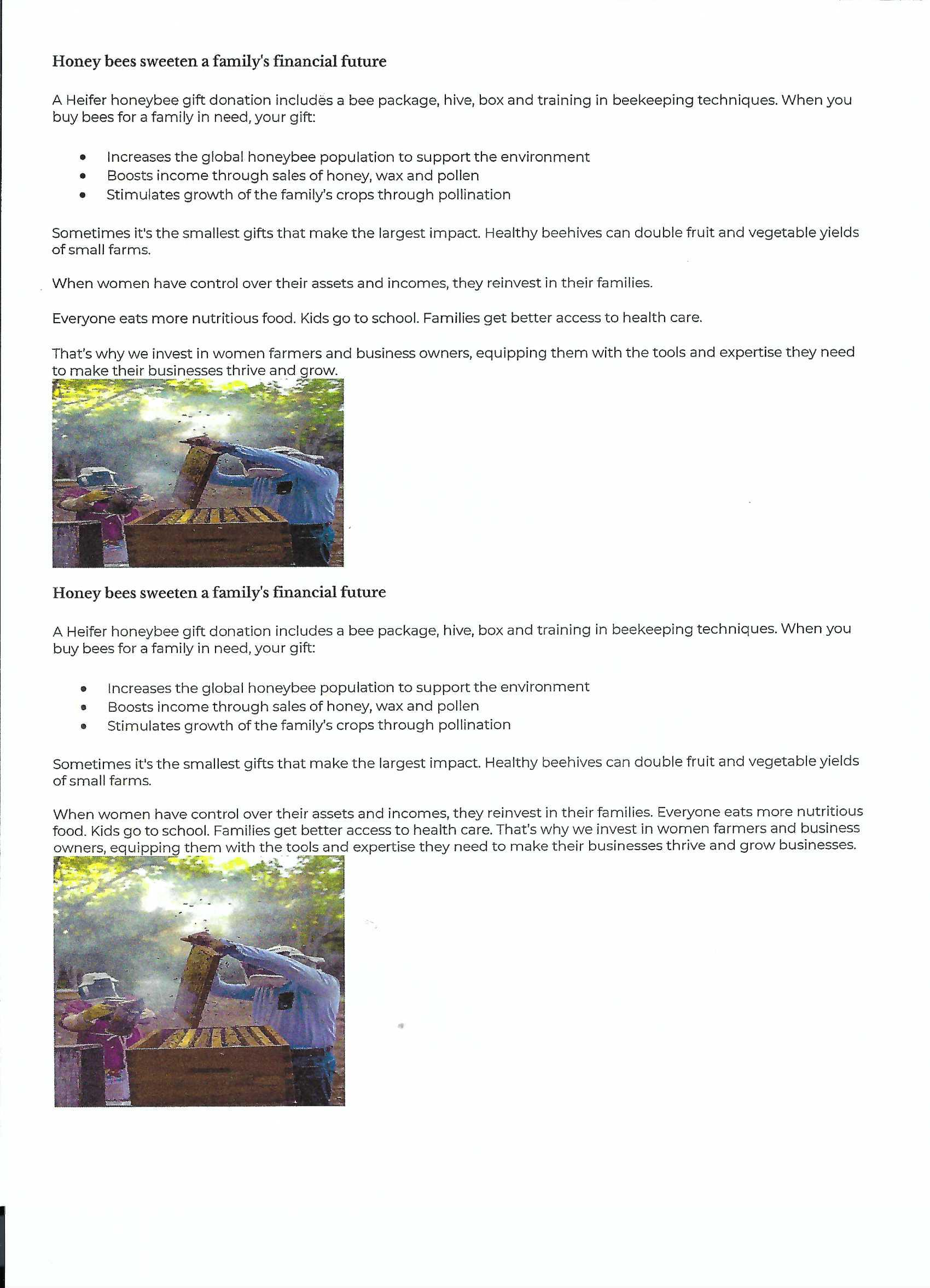 As of December 2024, we have sent Heifer International $16,429. With their additional matching funds, we were able to send 1,675 bee hives at $30.00 each, to be purchased for underprivileged women in Central America.